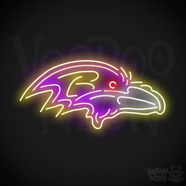 This neon sign, made of yellow, purple, white, and red, features a replica of the Baltimore Ravens logo.