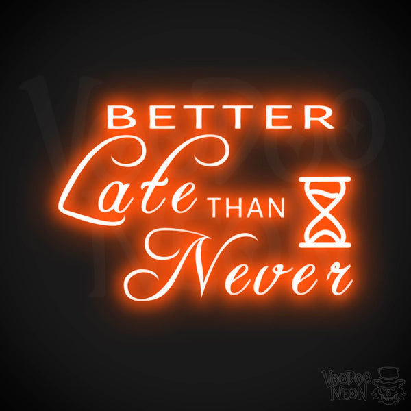 Brighten your space with the Better Late Than Never Neon Sign. This vivacious piece of LED wall art is more than just a sign – it's a bold proclamation of your positive, never-give-up attitude. The vibrant, colorful illumination serves as a daily reminder that timing is everything and that it's never too late to pursue your dreams. Tailored to meet your specific decor needs, this neon sign shines brilliantly in any setting, be it your bedroom or man-cave. This inspirational sign is not just about design, it's about motivation. Intricately crafted with precision, the LED sign ensures superior light dispersion, creating a cozy yet dynamic atmosphere that stirs creativity and ambition. As a part of Voodoo Neon's stunning collection, this Better Late Than Never Neon Sign combines aesthetics with a powerful message. Immerse yourself in its radiant glow and let it be a beacon of optimism in your journey towards achieving personal goals. Voodoo Neon remains committed to creating innovative lighting solutions that inspire, and this sign perfectly encapsulates that commitment. Ignite your space with this vibrant neon sign and embrace the belief that it's better late than never.