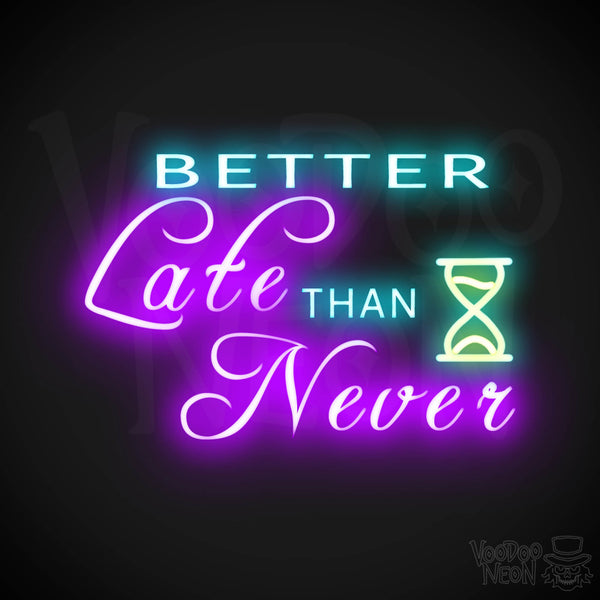 Brighten your space with the Better Late Than Never Neon Sign. This vivacious piece of LED wall art is more than just a sign – it's a bold proclamation of your positive, never-give-up attitude. The vibrant, colorful illumination serves as a daily reminder that timing is everything and that it's never too late to pursue your dreams. Tailored to meet your specific decor needs, this neon sign shines brilliantly in any setting, be it your bedroom or man-cave. This inspirational sign is not just about design, it's about motivation. Intricately crafted with precision, the LED sign ensures superior light dispersion, creating a cozy yet dynamic atmosphere that stirs creativity and ambition. As a part of Voodoo Neon's stunning collection, this Better Late Than Never Neon Sign combines aesthetics with a powerful message. Immerse yourself in its radiant glow and let it be a beacon of optimism in your journey towards achieving personal goals. Voodoo Neon remains committed to creating innovative lighting solutions that inspire, and this sign perfectly encapsulates that commitment. Ignite your space with this vibrant neon sign and embrace the belief that it's better late than never.