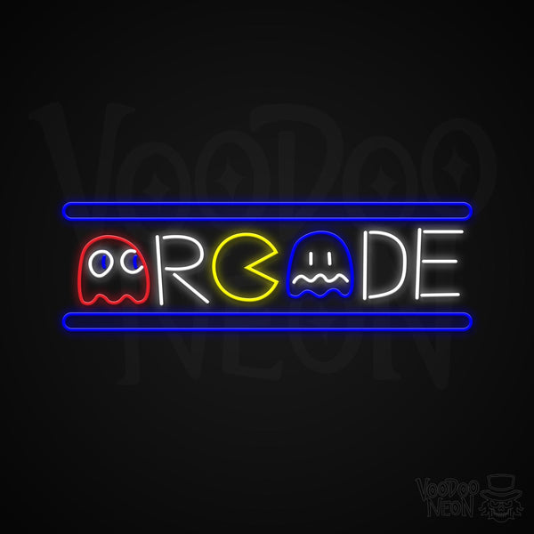 This neon sign features a gorgeous retro arcade with symbols and iconic characters from historical arcade games.